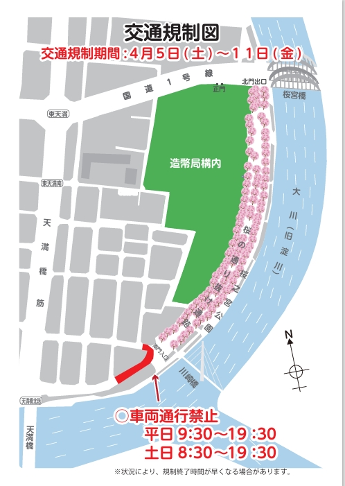 通り抜けは 造幣局南門(天満橋側)〜北門(桜宮橋側)への一方通行ルート で楽しみます 。